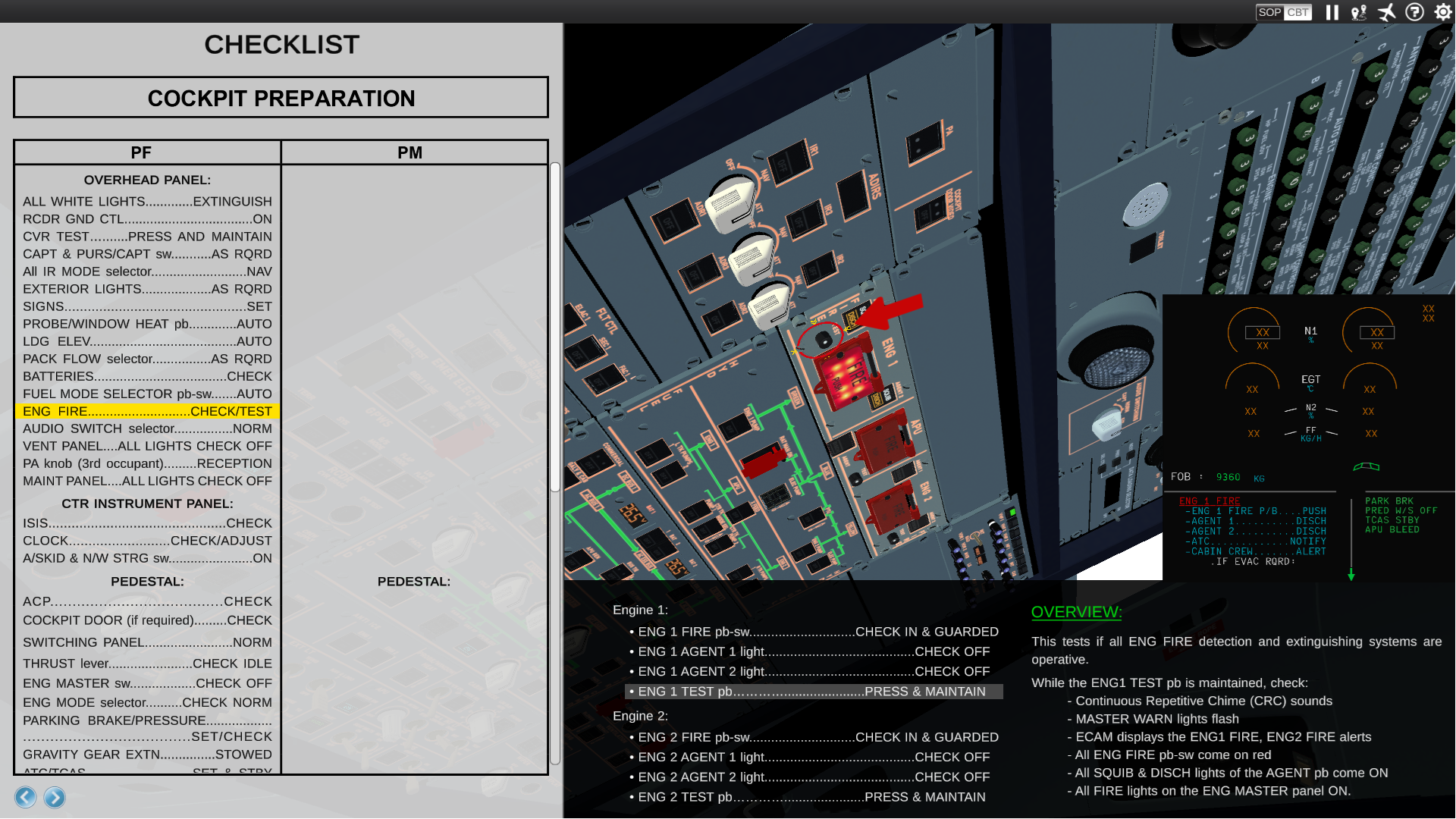 Note: 1. All interactions in this gallery, such as the oxygen test and engine 1 fire test, are triggered by clicking the respective buttons with the mouse or with the hand if in VR. 2. To proceed to the next checklist item, you can: • Click on the button or screen indicated by the checklist (guided by the red arrow and target), or • Press the blue button in the bottom-left corner, or • Click on the specific check in the checklist that you want to move to, or • If using VR, simulate a click with your finger, as you would in a real cockpit.